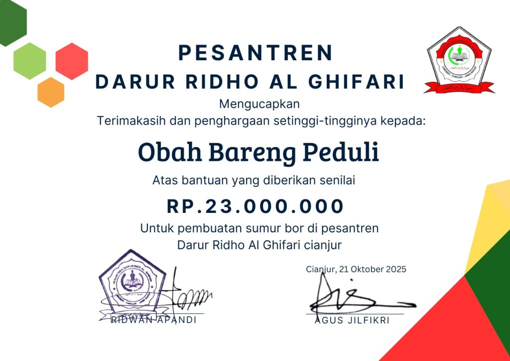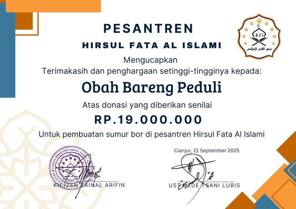 Sahabat Obah Bareng yg dirahmati ALLAH SWT, Alhamdulillah atas izin Allah SWT dan partisipasi dati para donatur, kami telah menyalurkan dana sebesar Rp.26.600.000 untuk pengadaan fasilitas Air bersih untuk Pesantren Aufia Global Islamic.