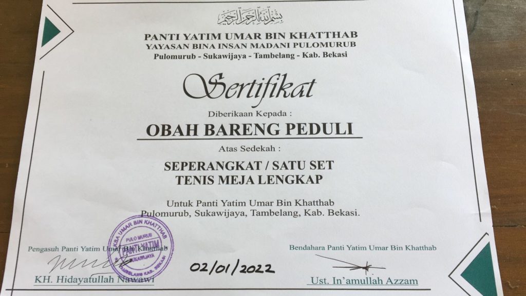 Alhamdulillah kami telah menyalurkan Wakaf Sarana Prasarana untuk pembelian Meja Pingpong Pesantren Umar Bin Khatab dengan total donasi yang kami salurkan Sebesar Rp. 2.211.100.