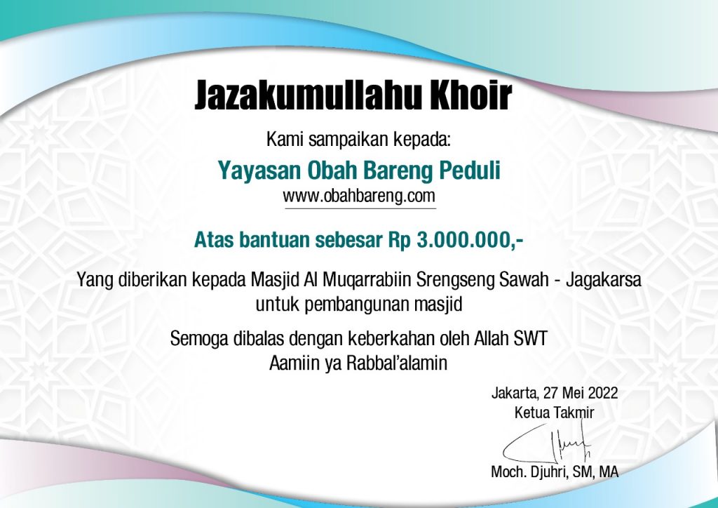 Sahabat Obah Bareng yang dirahmati Allah SWT Alhamdulillah kami telah menyalurkan Wakaf sebesar Rp.3.000.000 untuk pembangunan Masjid Muqarrabiin srengseng sawah jagakarsa
